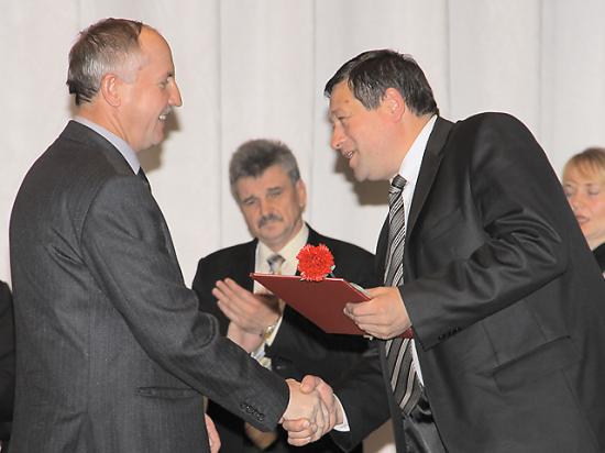 А тех, кто проявил себя в уходящем сельскохозяйственном году, кто внёс значительный вклад в развитие экономики нашего региона, ждали заслуженные награды, которые вручал Александр Николаевич Шубский. И первыми, кто вышел на сцену, стали руководители хозяйств Россонщины. Именно им были вручены Дипломы за достижения возглавляемых ими сельхозпредприятий в той или иной отрасли сельхозпроизводства. Так, КУП «Селявщина» в лице исполняющего обязанности директора Татьяны Георгиевны Лагодич было отмечено за увеличение урожайности и производства зерновых культур. За выполнение государственного заказа по сдаче зерна награждено КУСХП «Краснополье» (директор Сергей Максимович Карпенко), за наибольшее количество кормовых единиц на условную голову крупного рогатого скота, заготовленных в этом году, – КУП «Дворище-Рос» (директор Николай Адамович Муравейко), за вовлечение дополнительных посевных площадей в севооборот – ОАО «Клястицы» (директор Владимир Казимирович Бондаренко), за увеличение урожайности и производства семян рапса – ОАО «Россонский агросервис» (директор Вячеслав Григорьевич Хоменок), за рациональное использование сельскохозяйственных угодий – КУСХП «Сокол» (директор Владимир Григорьевич Федотов).