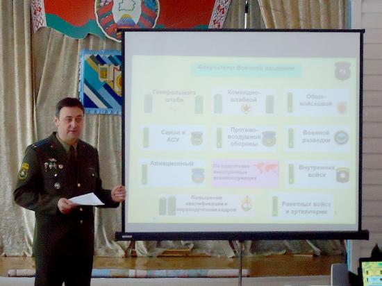 В прошлый четверг в гости к старшеклассникам учреждений образования района приехал преподаватель факультета военной разведки Военной академии Республики Беларусь, подполковник Владимир Владимирович Лицкевич (на снимке). Цель его встречи с будущими абитуриентами очевидна: предоставить подробную информацию о главном военном ВУЗе страны, рассказать о буднях курсантов и перспективах, которые открываются перед молодыми офицерами Вооруженных Сил Республики Беларусь.