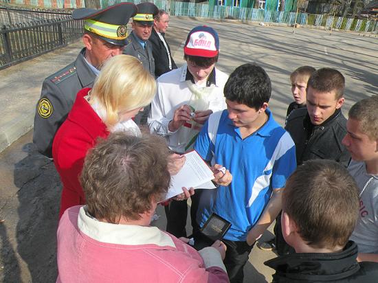 Торжественное построение. Жеребьёвка. Старт. И команды распределяются по этапам. Всего их 4. На первом – «Теоретический экзамен на знание Правил дорожного движения» – каждый участник отвечает на 10 вопросов программированного билета. Начальник ОГАИ Дмитрий Крыжановский и старший госавтоинспектор Виталий Воротынский находятся рядом с ребятами и следят за правильностью выполнения задания.