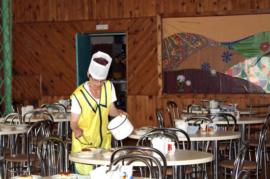 К слову, о питании. В лагере об этом хорошо заботятся. Сначала сбалансированное меню для школьников составляет технолог райпо, затем его утверждают в центре гигиены и эпидемиологии и только потом повара приступают к приготовлению блюд. Каждый день – новое меню. В рационе – творог, мясо, рыба, фрукты. Практически каждый день на столе присутствуют натуральные соки. Балуют детей выпечкой и даже сладостями. А вот от салатов технологи отказываются, предпочитая смешанные ингредиенты цельным овощам. Мало ли как плюсовая температура скажется на продуктах? А вот порезанные и ничем не заправленные огурцы и помидоры точно пойдут на пользу растущему организму. Сегодня в меню на завтрак манник, какао и бутерброд с мясом. В обед–гороховый суп, отварные макароны со свинной поджаркой, помидор, сок и хлеб. Полдник – кисель с печеньем.