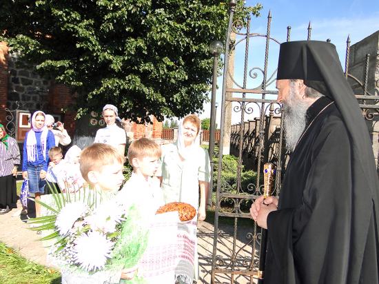 Нужно отметить, что все прихожане, среди которых было много ребятишек, в очень приподнятом настроении встречали Его высокопреосвященство: с хлебом-солью, живыми цветами и искренними улыбками. От самых ворот до входа в храм была выложена дорожка из зелени и лепестков живых цветов, по которой владыко проследовал в церковь.