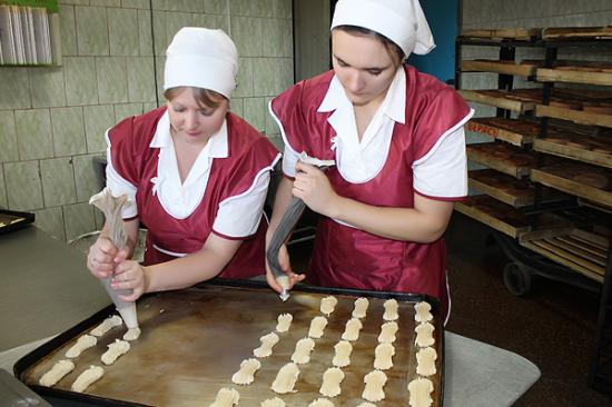 – На нашем предприятии трудится 54 человека. К счастью, сейчас на производстве нет текучести кадров, а в свое время это было головной болью. Случалось, что в смену некого было поставить. Теперь коллектив участка – сплоченная команда, – отмечает руководитель. – Сегодня мы производим хлебобулочные и кондитерские изделия. Выпускается более 60 наименований продукции. Стараемся работать над обновлением ассортимента. В конце декабря выпустили три новых вида хлеба, два – тортов (со сливками и консервированными фруктами). Сложностей внедрения новой продукции нет. Трудности появляются, когда формируется цена. Если слишком высокая, продукция будет нерентабельна, и выпускать её нет смысла. Безусловно, чтобы идти в ногу со временем, нужно обновлять и техническую базу. В 2010 году на предприятии установили новую печь, закупили линию по выпуску хлебобулочных изделий, машину для упаковки и нарезки хлеба, две тестомесильные машины. Осталось модернизировать кондитерский цех, чтобы девчата могли творить еще лучше. Кстати, кондитеры работают в две смены: с 14.00 и до 2 ночи. Но зачастую трудятся, пока не выполнят своё задание.