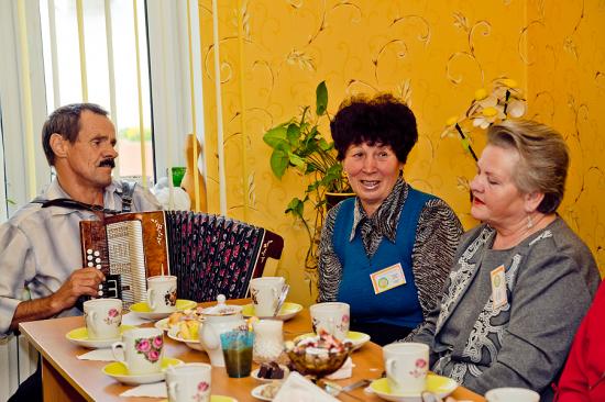 Мероприятие продолжилось чаепитием и чествованием двух именинниц. Раиса Сергеевна Тихинькая и Лариса Ивановна Яблонская получили приятные подарки и теплые поздравления от сотрудников Территориального Центра и участниц коллектива. Водитель центра Николай Михеев поздравил именинниц виртуозной игрой на гармони.