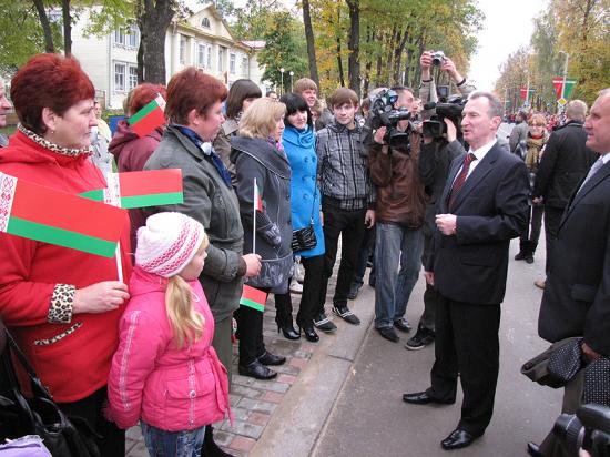 Аляксандр Мікалаевіч пад песні ансамбля «Свяціца» практычна ўзляцеў па прыступках і падышоў да мікрафона. Кветкі для дырэктара РДК Л. М. Уласавай, і старшыня аблвыканкама звярнуўся да жыхароў раёна і гасцей свята. У кожным слове яго прамовы адчувалася ўпэўненасць у годнай будучыні Расоншчыны. Аляксандр Мікалаевіч паабяцаў і надалей падтрымліваць наш раён, будаваць тут новыя сацыяльныя і вытворчыя аб’екты. А ў сваю чаргу расонцы павінны падумаць, як павілічыць насельніцтва нашага рэгіёна ў тры разы, а таксама больш старанна і эфектыўна працаваць кожны на сваім месцы. І тут не абышлося без шыкоўнага падарунка. Аляксандр Мікалаевіч уручыў Ларысе Міхайлаўне сертыфікат на набыццё самага сучаснага гука- і святлаабсталявання для РДК прыкладна на 600 мільёнаў рублёў і сімвалічны ключ ад абноўленага будынка. Перарэзаўшы разам са старшынёй райвыканкама А. М. Шубскім чырвоную стужку, кіраўнік вобласці зайшоў у раённы Дом культуры. «Мне здаецца, што я памыліўся, і гэта не раённы Дом культуры ў Расонах. Яшчэ год назад ён знаходзіўся ў безнадзейным становішчы,» – некалькі разоў паўтарыў Аляксандр Мікалаевіч – «На мой погляд, проста здорава». У кожным пакоі яго віталі расонскія самадзейныя артысты. А, пачуўшы задзірыстую мелодыю ў выкананні фальклорнага ансамблю «Нежачкі», старшыня аблвыканкама зрабіў некалькі танцавальных рухаў, а потым з задавальненнем апладзіраваў.