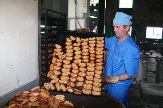 Тем временем, чтобы не стоять сложа руки,  наша бригада «занялась» сухарями.   Вопреки распространённому заблуждению, что их делают  по остаточному принципу из негодных зачерствевших батонов, миф развею–именно  из сухарного теста накануне выпекают соответствующие батоны. Сегодня Светлана Иванова занимается нарезкой сухарных батонов, а  её помощники каждый будущий сухарик выкладывают вручную для выпечки. После того как на лист ляжет последний сухарик,  их отправят в печь.  Через 15-20 минут любимое лакомство готово.