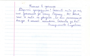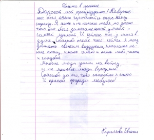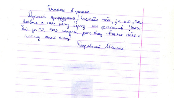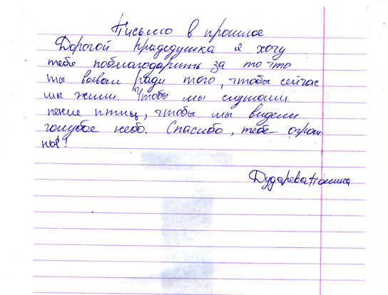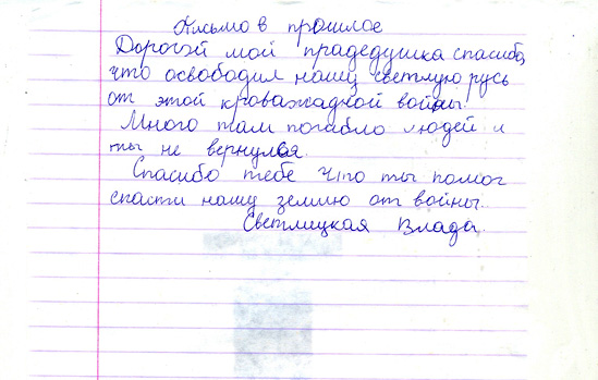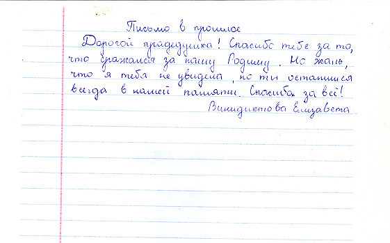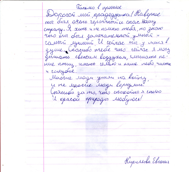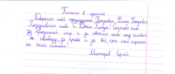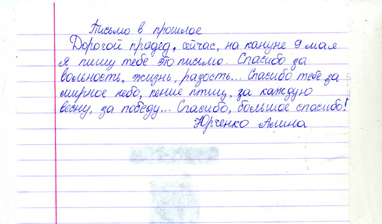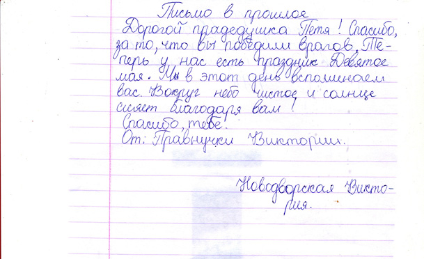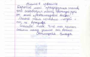 Все письма, написанные учениками, пронизаны чувством гордости и глубокого уважения к мужеству народа, совершившего Великий подвиг в войне с фашизмом. Все дети понимают, какой ценой досталась Победа нашему народу, бережно хранят память о поколении Великой Отечественной войны. И память эта – письма, посланные через годы дедам и прадедам, бабушкам и прабабушкам , детям войны или просто неизвестному солдату…