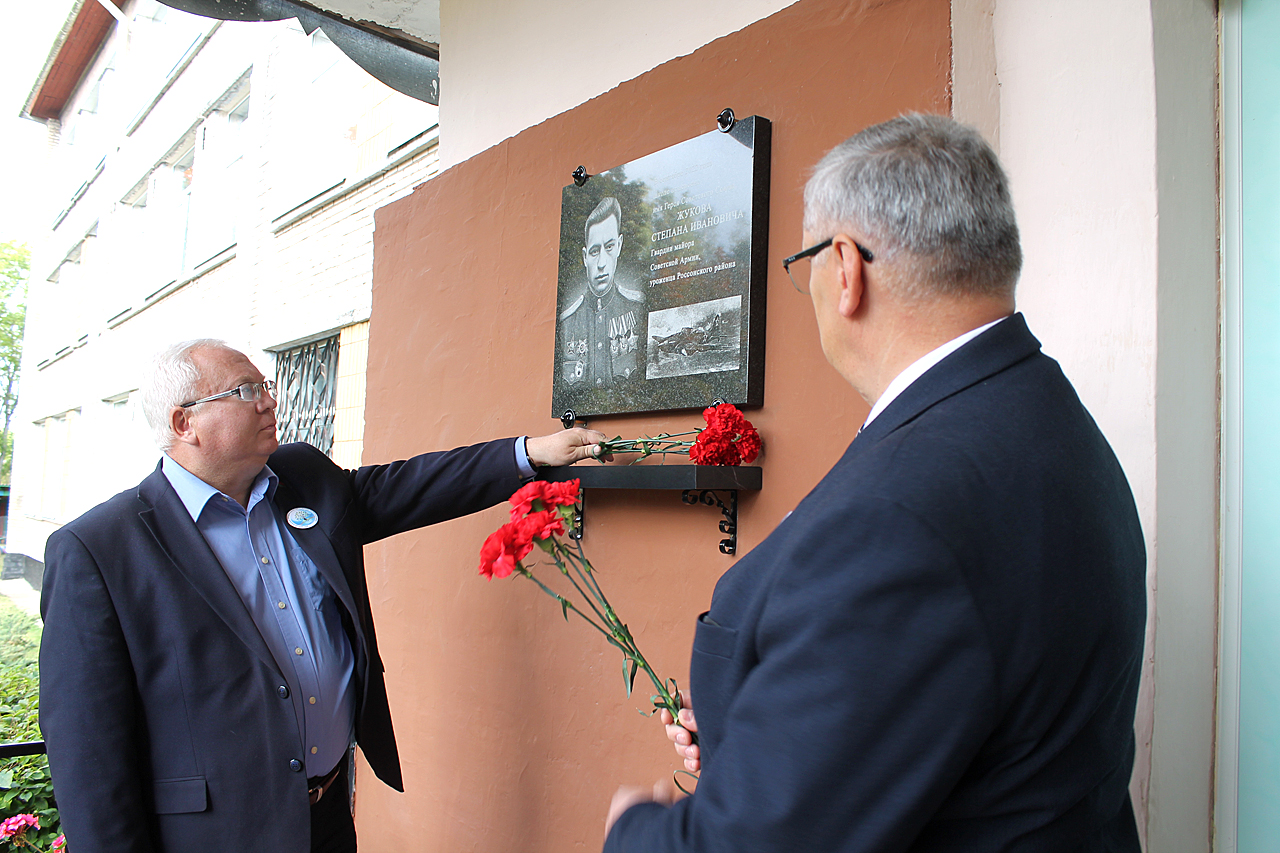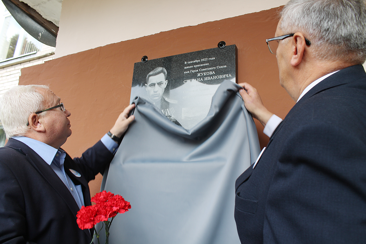 Право в торжественной обстановке открыть Мемориальную доску – почётного знака Героя Советского Союза Степана Ивановича Жукова предоставили Владимиру Терентьеву и Владимиру Быкову. Школьники, учителя и гости возложили цветы, а также почтили память погибших на войне и ушедших из жизни в мирное время ветеранов минутой молчания.