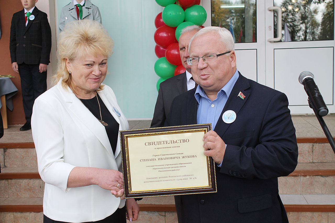 – Символично, что в канун Дня народного единства происходит важное для всей области событие – присвоение Краснопольской средней школе имени героя- земляка, – отметил глава депутатского корпуса Витебщины Владимир Терентьев. – То, что учреждение образования будет носить имя Степан Ивановича Жукова, – возможность помнить о человеке, учиться на его подвиге. Ежедневно читая имя героя, изучая его биографию, вы, ребята, через призму жизни Степана Ивановича начнёте оценивать собственные поступки и стремления. Ведь вы теперь не просто ученики, вы – «жуковцы». А это очень ко многому обязывает, – подчеркнул он и вручил директору учреждения образования Жанне Сидоренко Свидетельство о присвоении школе имени Героя Советского Союза Степана Ивановича Жукова. К слову, данное решение было принято членами Россонского районного исполнительного комитета 13 сентября 2022 года.