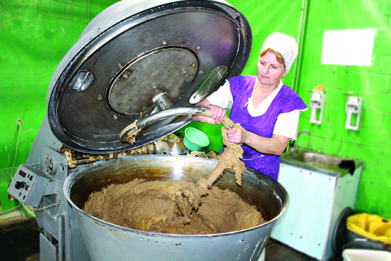 –На данный момент я ещё занимаюсь тестом на подовые хлеба. Вот здесь тесто для хлеба «Купец», – открывая тестомесильную машину, женщина демонстрирует эластичное тесто, которое она аккуратно проглаживает, собирает по краям и отправляет огромную дежу в комнату для брожения. –Уже через определённое время из готового теста можно будет формовать хлеб. Сейчас мы выпекаем много хлебов, где идёт ручная формовка.