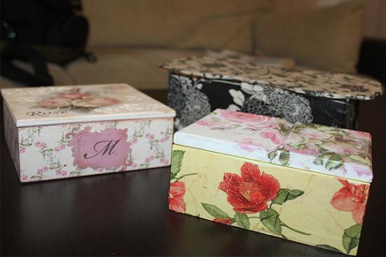 Кроме вышивания, Маина Викторовна освоила на сегодня модный вид рукоделия – декупаж. С помощью этой техники можно красиво и со вкусом оформить практически всё, что подскажет фантазия: шкатулки, вазочки, коробочки, стаканы, часы…