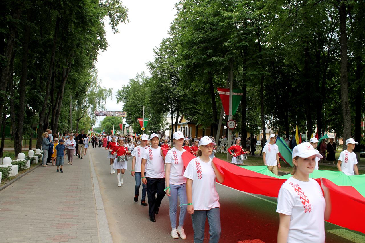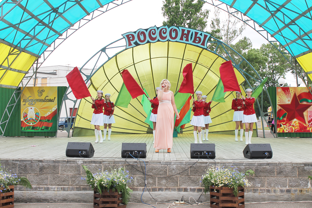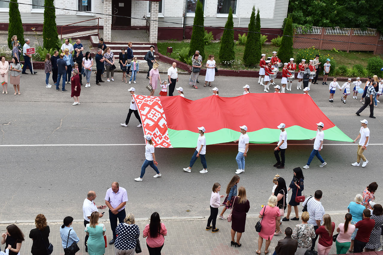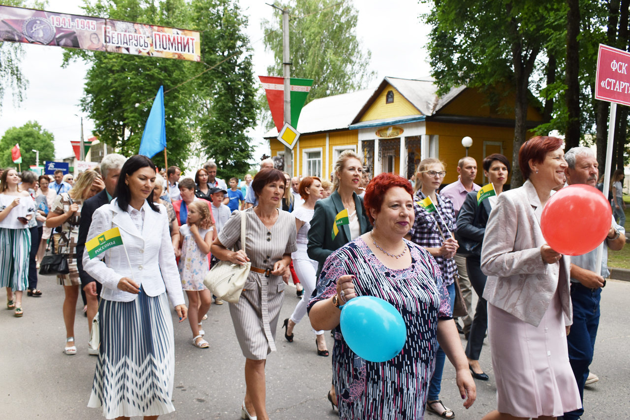 Праздничная программа в этом году началась шествием с государственным флагом Республики Беларусь по улице Советской. Огромное полотнище красно-зелёного цвета размером четыре на восемь метров пронёс молодёжный актив района. Юноши и девушки в костюмах с национальной символикой гордо держа в руках государственный флаг, ловили взгляды благодарных россонцев, которые по разным причинам не смогли попасть на праздник. Земляки махали руками из окон и балконов квартир, приветствовали молодёжь на улице.
