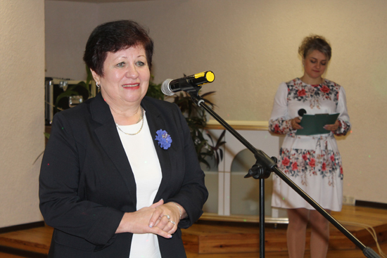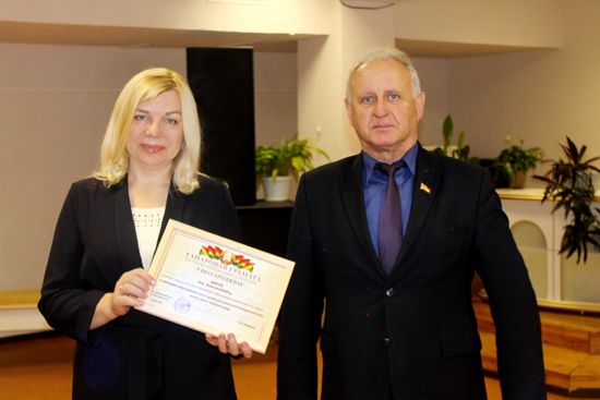 Глава депутатского корпуса поздравил присутствующих с юбилеем и исполнил приятную миссию: вручил начальнику отдела ЗАГС райисполкома Алле Бийчук за многолетний добросовестный труд в органах регистрации актов гражданского состояния и активное участие в общественной жизни Почётную грамоту Россонского районного Совета депутатов.