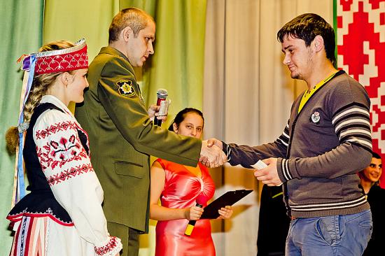 После теплых напутственных слов ведущая праздничного мероприятия Юлия Кухаренко вручила памятный подарок от отдела идеологической работы, культуры и по делам молодежи призывнику Егору Мясоедову за участие в областной спартакиаде молодых членов добровольных дружин, которая проходила в Витебске.